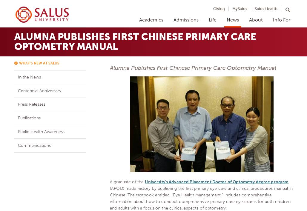 First Chinese Primary Care Optometry Manual!《眼健康管理》是中山眼科和SALUS大学校友合作力编,9月13日成为北美历史#!悠久的视光学院网站封面!