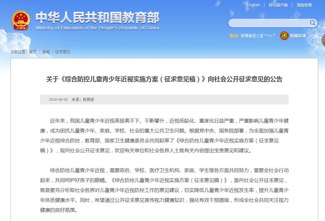 2018年8月2日,由党中央、国务院部署,旨在为全面加强儿童青少年近视综合防控,教育部、国家卫生健康委员会共同起草的《综合防控儿童青少年近视实施方案(征求意见稿)》公告对医疗卫生机构方面提出行动要求:“建立视力档案、规范诊断治疗、加强健康教育”。